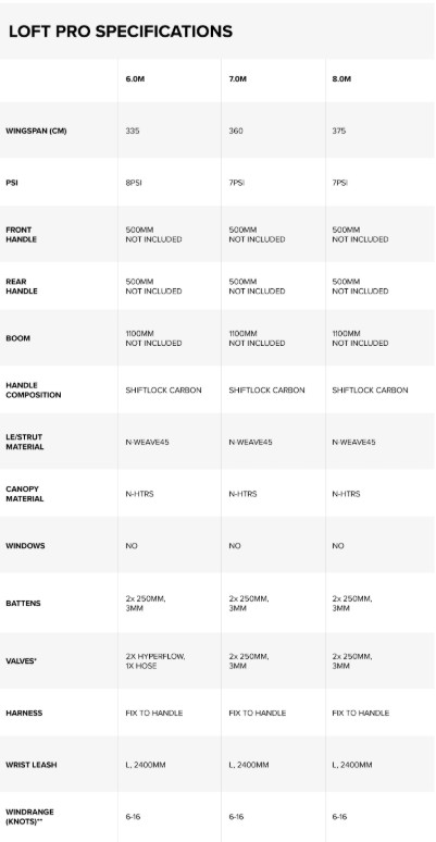 La manejable envergadura de la Loft Pro se adapta a cada piloto. Siga las recomendaciones de talla del rider para elegir sólo una talla de Loft Pro para su carcaj y acabar con la espera del viento.