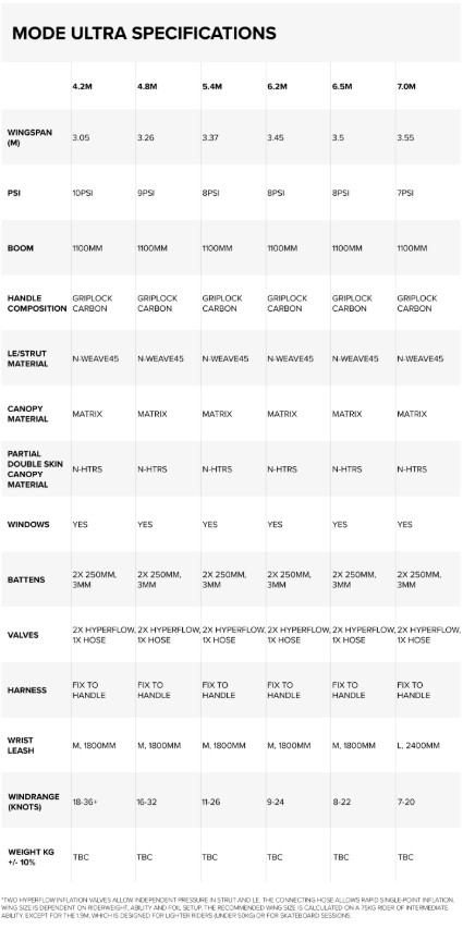 Un diseño de mayor alargamiento es más eficiente a velocidades de viento aparente más altas, donde el ala genera más sustentación para una resistencia dada. El ala de 4,2 metros tiene la relación de aspecto más alta, que disminuye con cada talla.